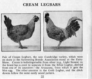The Cream Legbar was presented at the 1947 London Dairy Show as a new breed of cream colored autosexing chicken, friendly in temperament, and prolific layer of blue eggs. The recessive nature of the cream color, the dominate blue egg color, and the crest which sets this breed apart from its similar Legbar relations was discovered in genetic experimentation performed by Professors R.C. Punnett and Michael Pease.